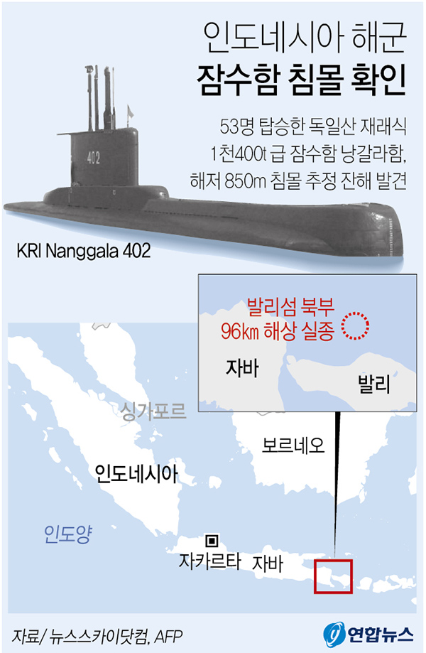 독일산 재래식 1천400t급 잠수함 낭갈라함은 지난 21일 오전 3시 25분(자카르타 시각 기준)께 발리섬 북부 96㎞ 해상에서 어뢰 훈련을 위해 잠수한 뒤 실종됐다.