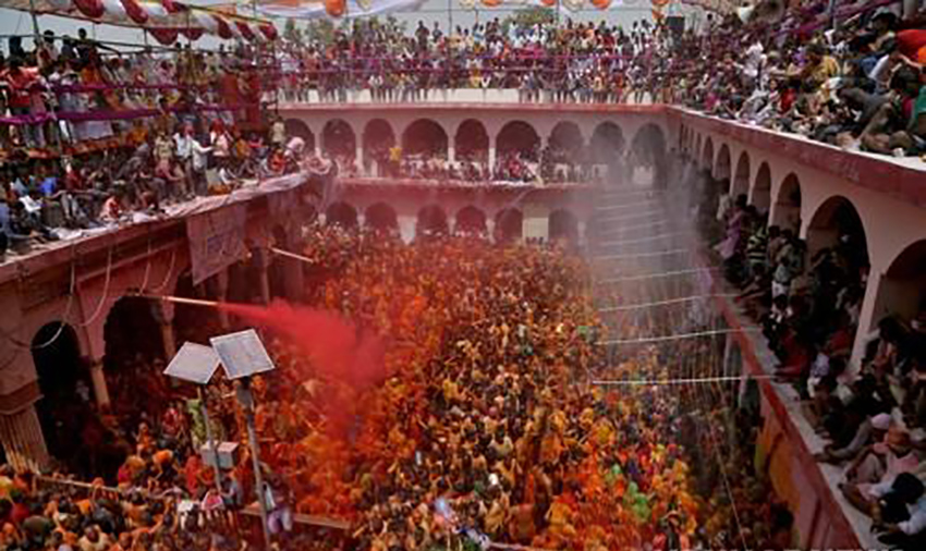 3월 30일 인도 마투라의 힌두교 사찰에서 열린 홀리 축제. [로이터]