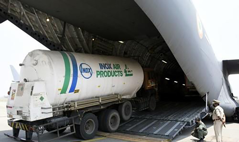 4월 19일 의료용 산소 트럭을 실은 인도 열차와 군용기에 싣는 모습. [AFP=연합뉴스]