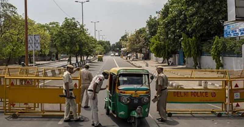 4월 17일 주말 통행금지가 내려진 인도 수도 뉴델리에서 통행자의 신원을 체크하는 경찰. [AP]