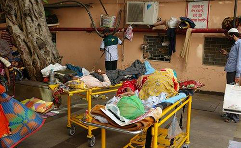 4월 19일 인도 뉴델리의 사프다르정 병원 밖에서 빈병상이 나기를 기다리는 코로나19 환자들. [연합]