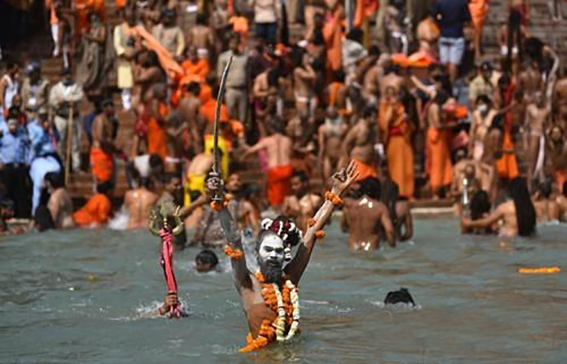 4월 14일 우타라칸드주 하리드와르의 갠지스강변에서 열린 쿰브 멜라 축제에서 입수를 준비 중인 힌두교 수행자들. [로이터]