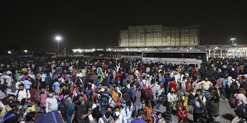 4월 19일 봉쇄령을 피해 귀향하려고 버스 터미널에 운집한 인도 뉴델리의 이주노동자. [AP]