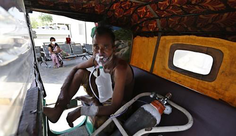 인도 아메다바드의 한 병원 밖 3륜 택시에서 4월 22일 산소 치료를 받는 코로나19 환자. [AP]