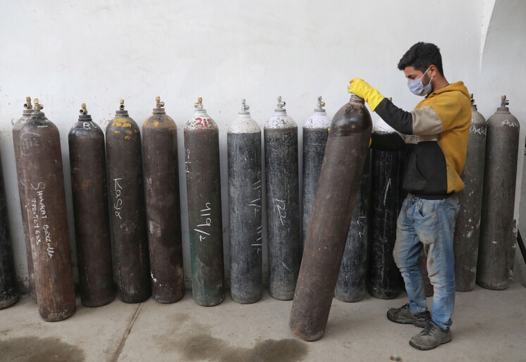인도 카슈미르주 스리나가르에서 19일 한 남성이 산소통을 옮기고 있다. 스리나가르/EPA 연합뉴스