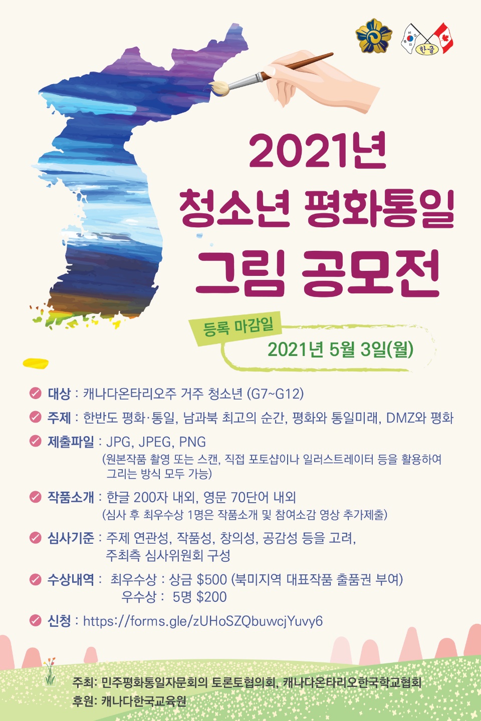 민주평통 토론토협의회(회장 김연수)와 온타리오 한국학교협회(회장 신옥연)는 재외동포 청소년들의 한반도 평화와 통일에 관한 관심과 긍정적 인식 확산을 위한 '2021청소년 평화통일 그림공모전'을 공동으로 개최한다.