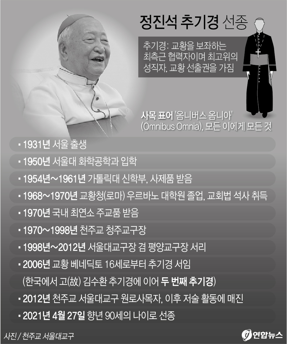 천주교 서울대교구장을 지낸 정진석 추기경이 27일 선종했다. 향년 90세.