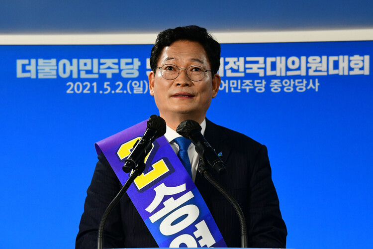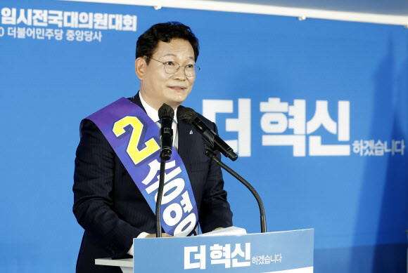 민주당은 2일 서울 여의도 당사에서 임시전국대의원대회(전당대회)를 열어 송 후보를 당 대표로 선출했다. 송 후보는 대의원과 권리당원 투표(각각 45%, 40%), 일반당원과 국민 여론조사(각각 5%, 10%)를 합산한 결과 최종 득표율 35.6%를 얻어 2위 홍영표 후보(35.01%)를 간발의 차이로 눌렀다.