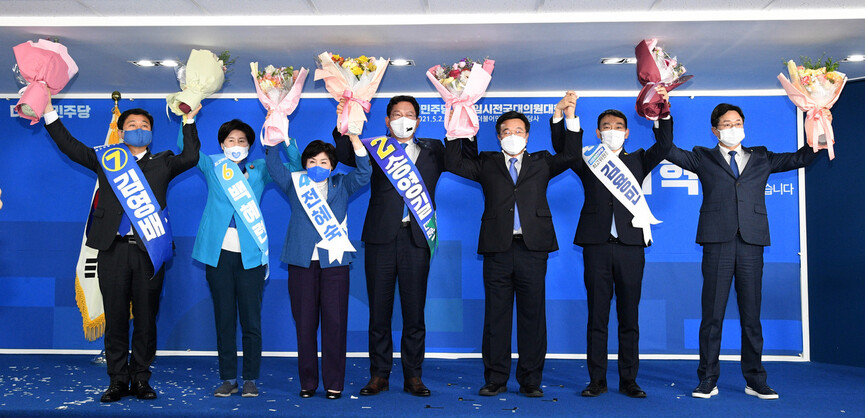 더불어민주당 새 대표로 선출된 송영길 의원(가운데)과 김영배(왼쪽부터), 백혜련, 전혜숙 최고위원, 윤호중 비상대책위원장, 김용민, 강병원 최고위원이 2일 서울 여의도 중앙당사에서 열린 임시전국대의원대회에서 꽃다발을 들고 기뻐하고 있다. 연합뉴스