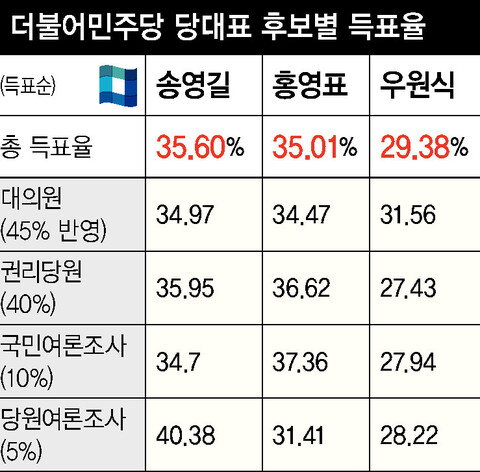 이날 대의원·권리당원 투표와 당원·국민 여론조사 합산 결과 35.6%의 득표율로 1위를 차지한 송영길 대표는 대의원과 일반당원 투표에선 1위를 했고, 권리당원과 국민여론조사에선 홍 후보에게 뒤졌다. 합산 때 반영 비율이 45%인 대의원 선거인단에선 0.5%포인트 우세했고, 40%가 적용되는 권리당원에선 0.67%포인트차로 밀렸다.