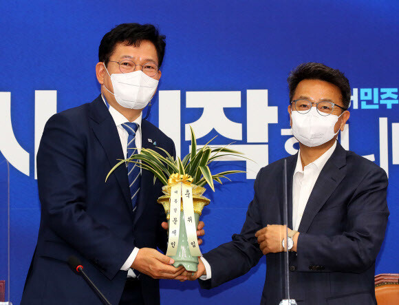 더불어민주당 송영길 새 대표(왼쪽)가 3일 서울 여의도 국회에서 이철희 청와대 정무수석으로부터 문재인 대통령의 축하 난을 전달받고 있다. 연합뉴스