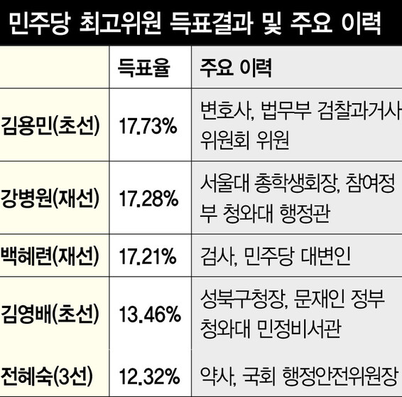 7명 후보자 중 5명을 뽑은 최고위원 경선에서는 ‘슈퍼여당의 힘으로 선명한 검찰·언론개혁’을 주장한 김용민 의원(경기 남양주 병·초선)이 17.73%를 득표해 1위를 차지했다. 재선의 강병원(서울 은평을), 백혜련(경기 수원을) 의원이 각각 17.28%, 17.21%를 득표해 근소한 차이로 2·3위를 기록했다. 김영배 의원(서울 성북갑·초선)과 전혜숙 의원(서울 광진갑·3선)도 각각 13.46%, 12.32%를 득표해 최고위원으로 선출됐다.