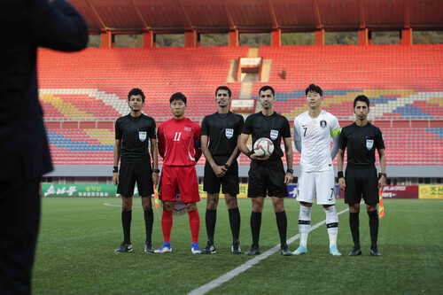 2019년 10월15일 북한 평양 김일성경기장에서 열린 2022 카타르 월드컵 아시아 2차 예선 H조 남북한 경기에서 양 팀 주장이 기념촬영을 하고 있다. 대한축구협회 제공