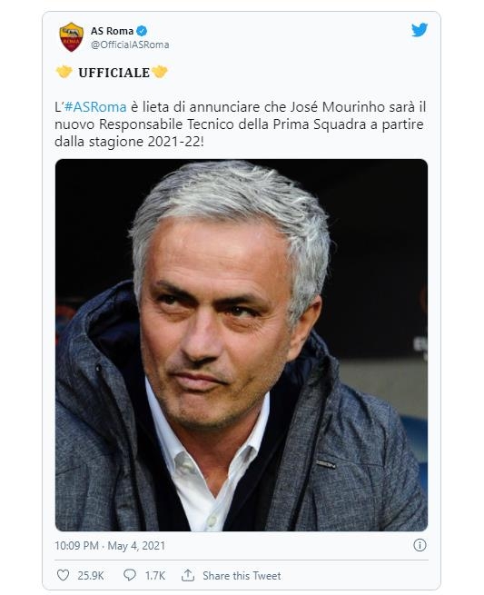 모리뉴 감독의 선임을 발표한 AS로마.[AS로마 트위터]