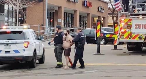 볼더 총격 당시 사건 직후 경찰에 체포돼 연행된 남성 [트위터 게시물 캡처]
