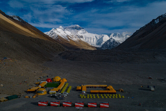 세계 최고봉 에베레스트(초모룽마) 정상이 바라다 보이는 중국 쪽 베이스 캠프. 중국 당국은 에베레스트 정상에 코로나19 방역을 위한 격리선을 설치하겠다고 밝혔다. 에베레스트/신화 연합뉴스