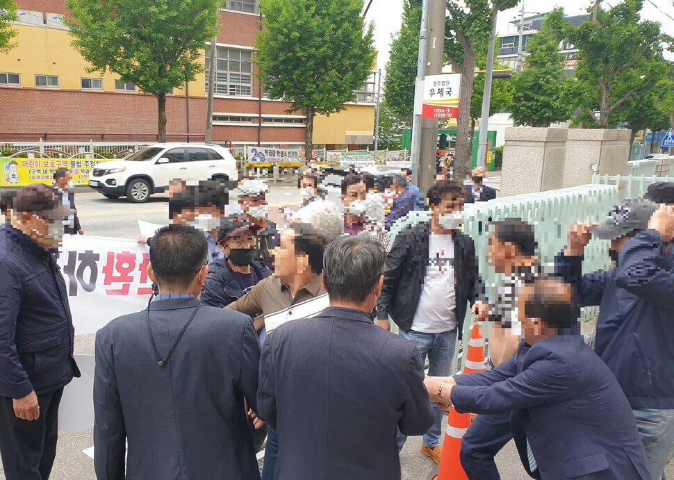 같은 시각 법원 후문 맞은편에서 ‘전두환을 구속하라’ 구호를 외치던 동산초등학교 저학년 학생들은 갑작스러운 어른들의 몸싸움에 깜짝 놀라는 모습이었다. 두 단체 회원들은 지난 3월4일 황기철 국가보훈처장이 국립5·18민주묘지를 방문했을 때도 말싸움을 벌여 빈축을 샀다.