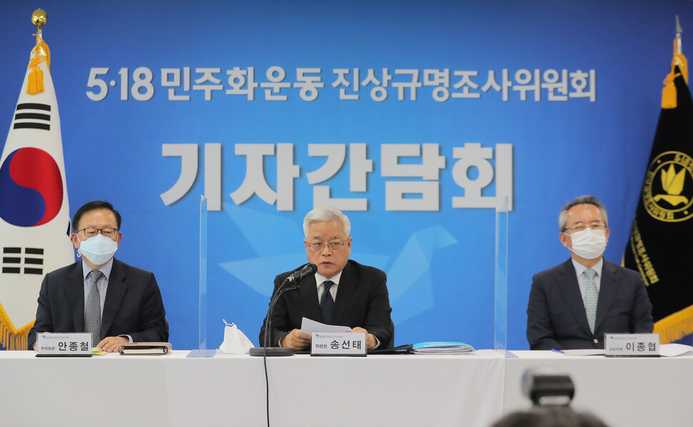 12일 서울 중구 나라키움저동빌딩에서 열린 5·18 민주화운동 진상규명조사위원회 기자간담회에서 송선태 위원장이 중간 조사 결과를 말하고 있다. 연합뉴스