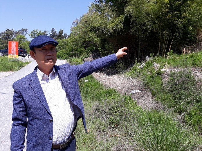 송암공단 안 연탄공장 관리부장으로 근무했던 류시열(76)씨가 2019년 5월3일 <한겨레>와의 인터뷰에서 남구 송암동 오케이자동차학원 옆 빈터를 가리키며 민간인 학살 의혹에 관해 이야기하고 있다.