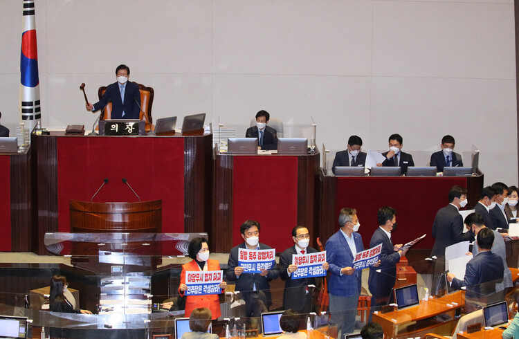 박병석 국회의장이 13일 저녁 국회 본회의장에서 김부겸 국무총리 후보자의 임명동의안 표결을 위해 개의를 선포하고 있다. 국민의힘 의원들은 김 후보자 인준을 받대하는 손팻말을 들고 항의하고 있다. 연합뉴스
