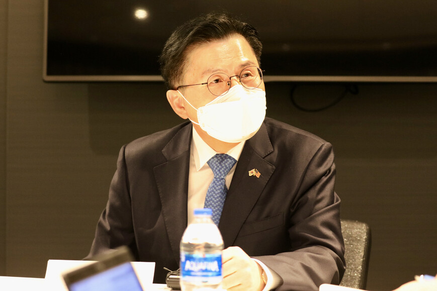미국을 방문 중인 황교안 전 미래통합당 대표가 11일 워싱턴DC 한 호텔에서 특파원 간담회를 진행하고 있다. 지난 5일 방미한 황 전 대표는 12일 귀국길에 올랐다. 연합뉴스