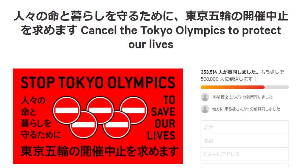 마이니치신문에 따르면 도쿄올림픽 개최를 반대하는 온라인 서명운동을 주도한 우쓰노미야 겐지(宇都宮健兒) 전 일본변호사연합회 회장은 이날 35만명이 넘는 반대 서명을 도쿄도와 국제올림픽위원회(IOC), 일본 정부, 도쿄올림픽·패럴림픽 조직위원회 등에 제출했다.
