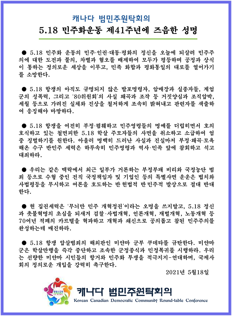 캐나다 범민주원탁회의 '5.18 민주화운동 제41주년 즈음한 성명' 발표