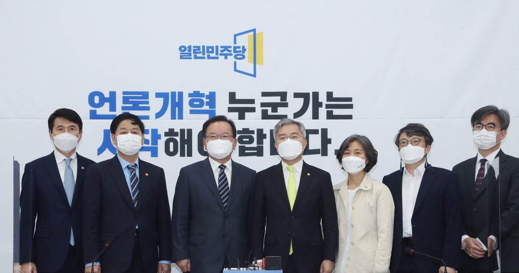김부겸 총리, 열린민주당 예방: 김부겸 신임 국무총리가 17일 서울 여의도 국회에서 열린민주당 최강욱 대표를 예방해 기념촬영하고 있다. 왼쪽부터 최창원 국무1차장, 구윤철 국무조정실장, 김부겸, 최강욱, 강민정 원내대표, 김의겸 의원, 김성회 대변인.