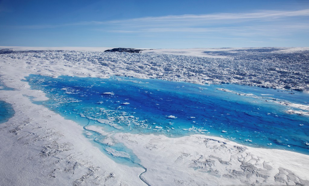 2018년 6월 그린란드의 한 빙하 일부가 녹아내려 웅덩이가 형성됐다.[로이터=연합뉴스]