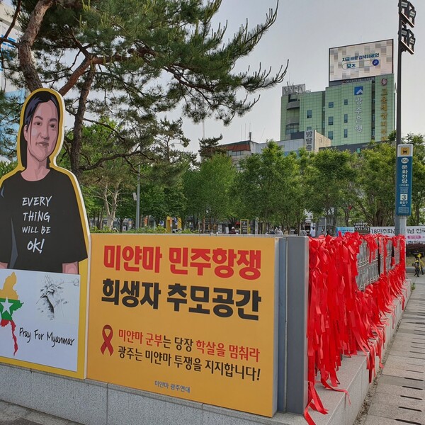 또 옛 전남도청 별관 앞에 미얀마 민주화운동 희생자들의 사진을 게시하고 추모의 의미로 빨간 리본을 매달아 두고 있다.