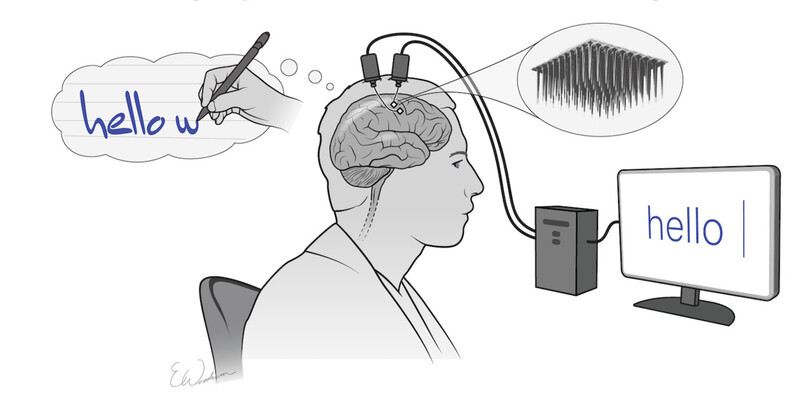 머릿 속으로 글자를 쓰면, 뇌에 심어놓은 센서가 이 신호를 받아 인공지능에 전해주고, 이를 접수한 인공지능이 신호를 해석해 컴퓨터 화면에 글자를 띄워준다.