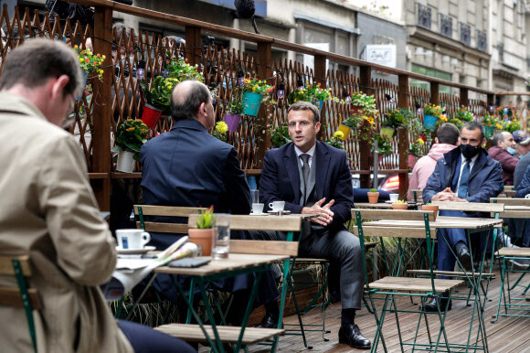 에마뉘엘 마크롱 프랑스 대통령(오른쪽)과 장 카스텍스 총리(왼쪽)가 지난 19일 파리의 한 카페 테라스에서 커피를 마시고 있다. 프랑스 정부는 이날부터 카페와 바, 식당은 실외석에 한해 영업을 허용했다. AFP/연합뉴스