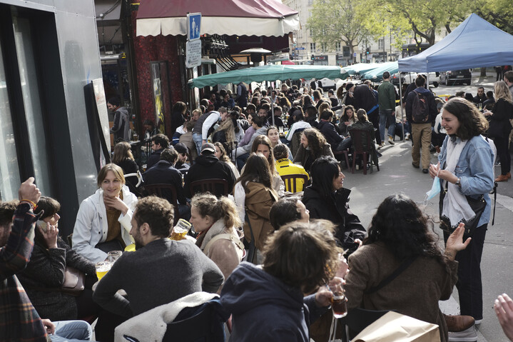 19일 프랑스 파리 카페 실외석에 맥주와 커피를 마시고 있는 시민들로 북적이고 있다. 파리/AP 연합뉴스