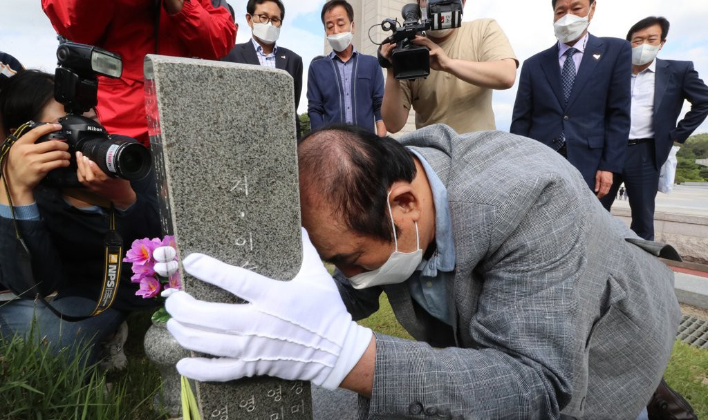 5·18 열사 묘비 붙잡고 사죄하는 계엄군 지휘관: 21일 오후 광주 북구 국립 5·18 민주묘지에서 1980년 5월 3공수여단 11지역대대장으로 광주에 투입됐던 신순용 전 소령이 옛 광주교도소 관련 열사의 묘비를 붙잡고 사죄하고 있다.