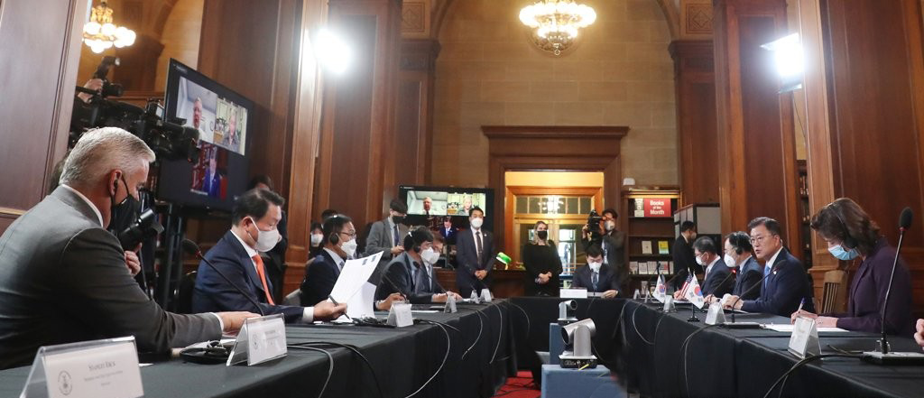 문 대통령은 인사말에서 "미국과 한국은 서로에게 가장 중요한 투자 파트너"라며 "최근 코로나 위기로 경제협력의 중요성이 더욱 커졌다"고 평가했다.