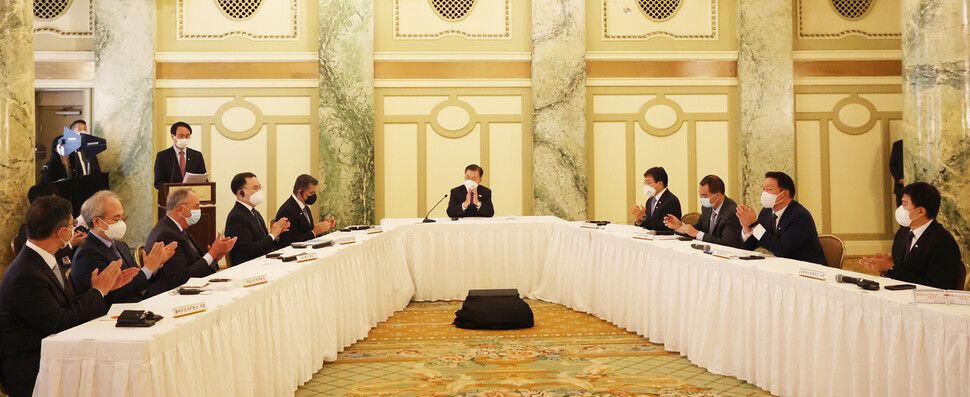 문재인 대통령이 22일 오전 미국 워싱턴의 한 호텔에서 열린 ‘한-미 백신기업 파트너십 행사’에 참석해 발언하고 있다. 왼쪽부터 안재용 에스케이(SK) 바이오사이언스 대표, 권준욱 국립보건연구원장, 스탠리 어크 노바백스 시이오(CEO), 문승욱 산업통상자원부 장관, 하비에르 베세라 미국 보건장관, 문 대통령, 권덕철 보건복지부 장관, 스테판 반셀 모더나 시이토(CEO), 최태원 대한상공회의소 회장, 존 림 삼성 바이오로직스 대표. 연합뉴스