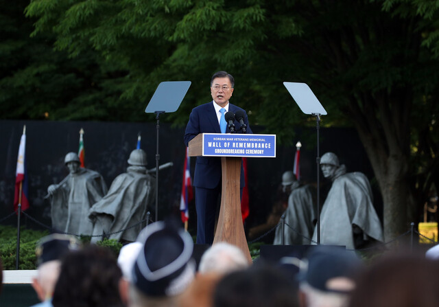 문재인 대통령은 21일 오후 워싱턴에 자리한 한국전 참전용사 기념공원에서 열린 ‘미 한국전 전사자 추모의 벽’ 착공식에 참석했다. 미국 도착 뒤 알링턴 국립묘지 헌화(20일)와 한국전쟁 참전 미 퇴역 군인 명예훈장 수여식 참석(21일)에 이은 한-미 동맹 강조 행보다.