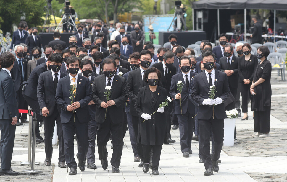 권양숙 여사 등 참석자들이 23일 오전 경남 김해시 진영읍 봉하마을에서 엄수된 노무현 전 대통령 서거 12주기 추도식에서 참배하고 있다. 연합뉴스