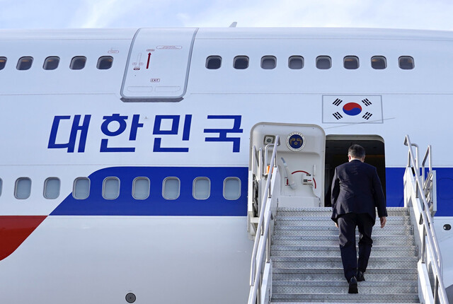 방미 일정을 마친 문재인 대통령이 22일 오후 미국 하츠필드 잭슨 애틀랜타 국제공항에서 공군1호기에 탑승하고 있다. 연합뉴스