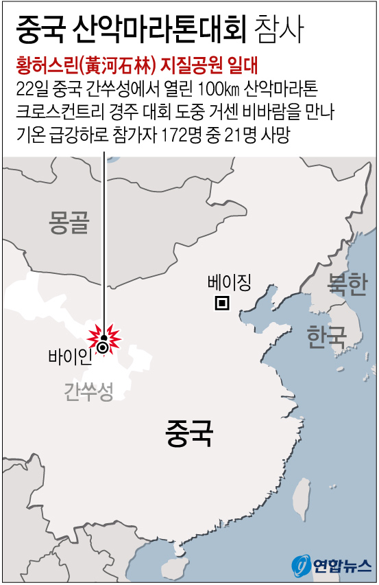 중국 CCTV 등은 23일 서북부 간쑤(甘肅)성에서 전날 열린 100㎞ 산악마라톤 크로스컨트리 경주 대회 도중 거센 비바람을 만나 참가자 21명이 사망했다고 구조 당국을 인용해 보도했다.
