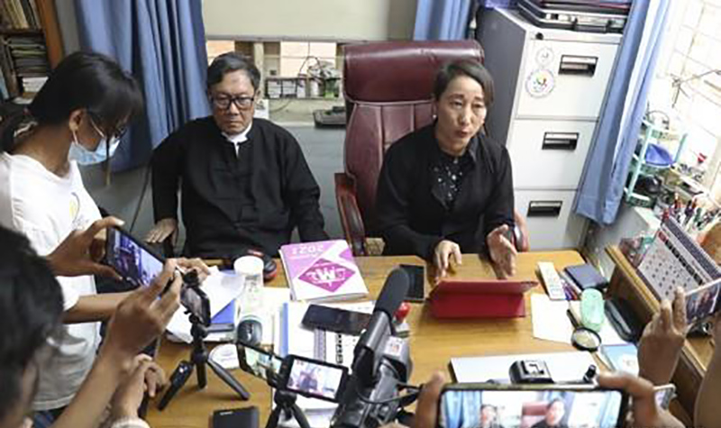 아웅산 수치 국가고문 변호인단이 접견 후 언론과 만나고 있다. [AP=연합뉴스]