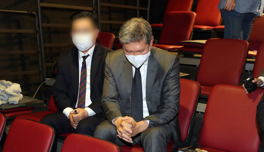 노태우 전 대통령의 외아들인 노재헌 동아시아문화센터 원장이 25일 광주 동구 광주아트홀에서 5·18 민주화운동을 다룬 연극 '애꾸눈 광대' 관람을 마친 뒤 객석 일부에서 책임 있는 행동 등 부친의 진정성 있는 사죄가 먼저라는 항의가 터져 나오자 고개 숙이고 있다.