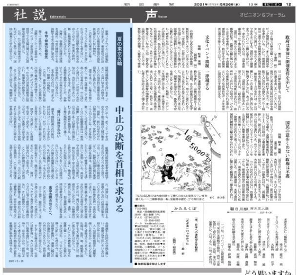 도쿄올림픽 후원사인 <아사히신문>이 통사설을 통해 스가 요시히데 총리에게 “올림픽을 중단하라”고 촉구했다. 주요 언론사가 올림픽 중단을 직접적으로 요구한 것은 이번이 처음이다.