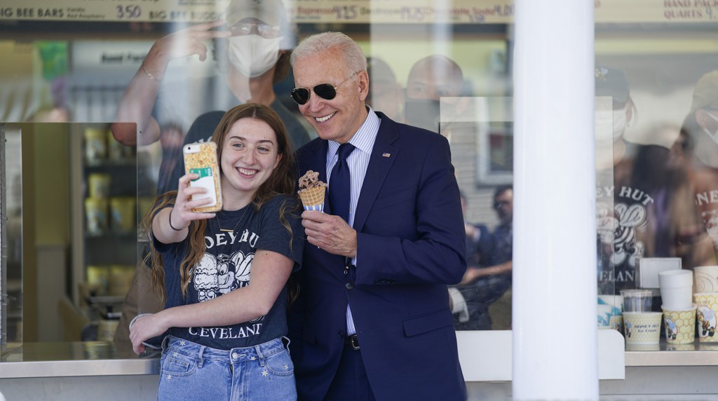 조 바이든 미국 대통령이 27일 아이스크림 가게에 들르며 소탈한 모습을 연출했다.