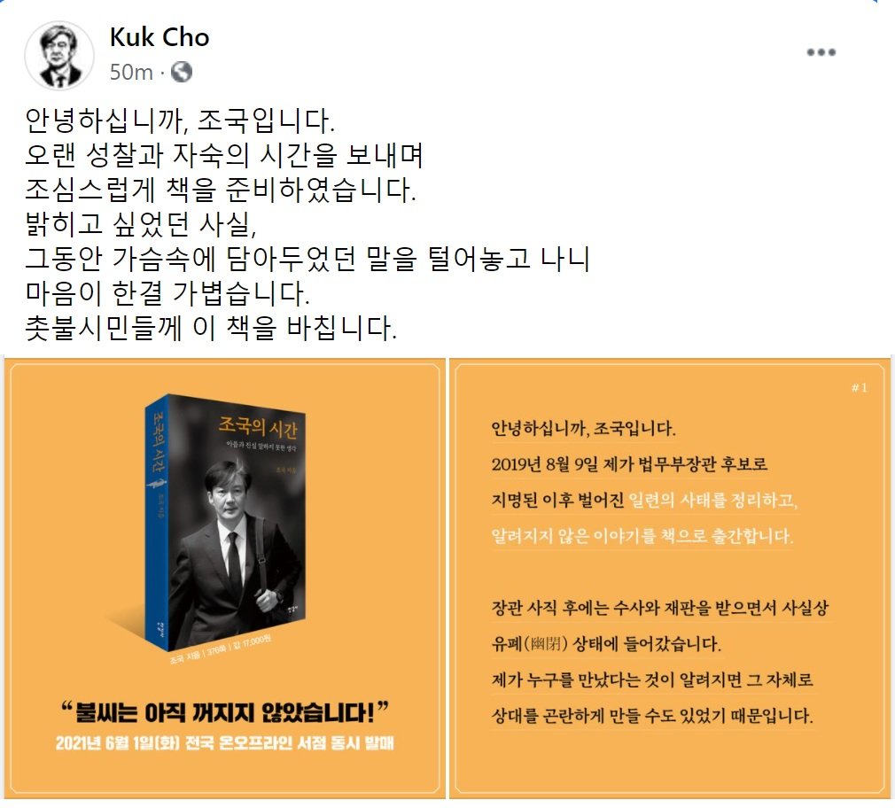 조국 전 법무부 장관은 5월 27일 사회관계망서비스(SNS)에 자신이 쓴 책 '조국의 시간: 아픔과 진실 말하지 못한 생각'이 6월 1일 전국 온·오프라인 서점을 통해 발매된다고 전했다. [조 전 장관 페이스북 캡처]