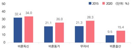 이 비율은 2010년 15.8%, 2015년 21.3%로 계속 상승해 왔다. 2015년과 지난해를 비교하면 1인가구 비율은 9.1%포인트 올랐다.