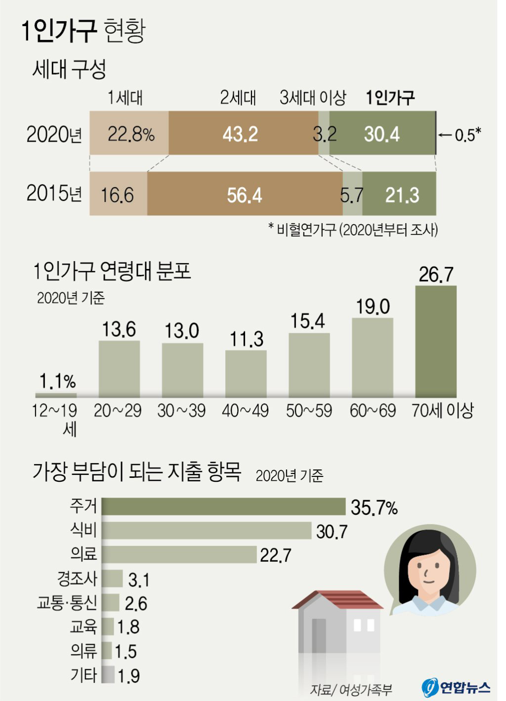 1인 가구는 생활비 부담과 정부에서 지원해주기를 바라는 부분 모두에 대해 '주거문제'를 1순위로 꼽았다.