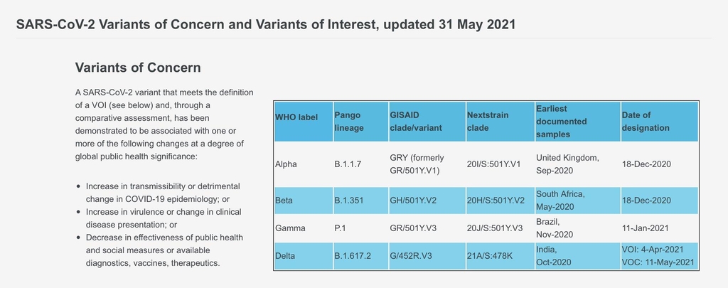 또 브라질에서 처음 보고된 변이(P.1)는 '감마'로, 인도에서 처음 발견된 변이(B.1.617.2)는 '델타'로 이름을 붙였다.