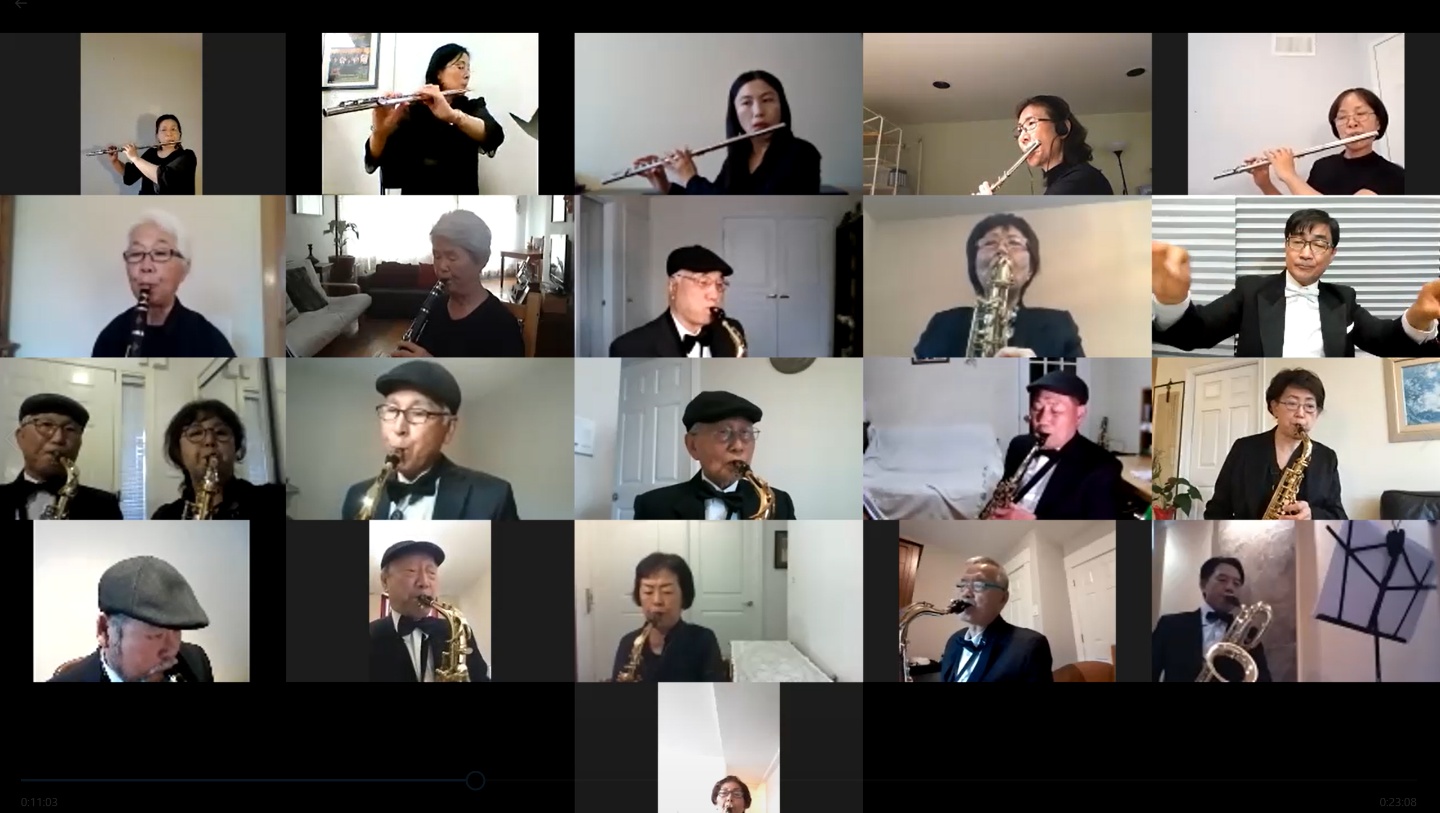 토론토에 거주하는 한인 시니어들로 구성된 시니어 윈드앙상블의 단원들은 대부분 70이 넘은 나이에도 열정적으로 참여하여 악기를 다루면서 연주해야 하는 만만치않은 첫 연주회를 온라인으로 짜임새 있게 준비했다.