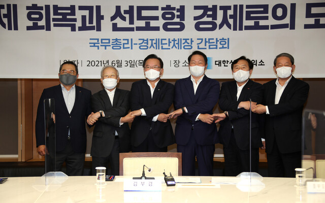문재인 정부와 재계와의 거리가 부쩍 가까워지고 있다. 문재인 대통령이 전날 현대차·엘지(LG)·에스케이(SK) 등 국내 4대 그룹 총수들을 청와대로 초청해 오찬 간담회를 한 데 이어 3일엔 김부겸 국무총리가 대한상공회의소·한국경영자총협회·중소기업중앙회 등 경제 5단체를 만났다. 4일에는 이호승 청와대 정책실장이 문승욱 산업통상자원부 장관과 함께 5대 그룹 사장단을 만날 예정이다.